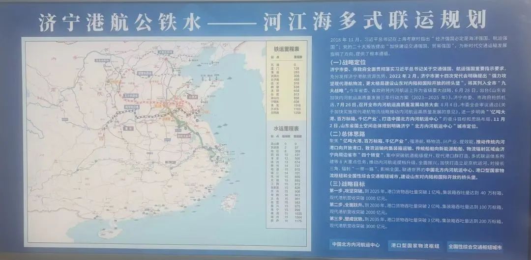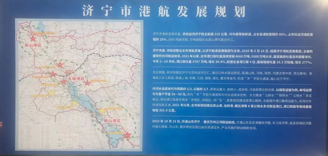 济宁因运河而兴,素有“运河之都”的美誉,内河航运资源富集,济宁港是全国36个内河主要港口之一,规划航道47条总里程1100公里,其中京杭大运河主航道210公里均为高等级航道,占山东全省80%、京杭大运河25%,在沿线通航13个城市中居第1位。2000吨级船舶、万吨级船队可从济宁通江达海。瓦日铁路、新兖铁路在济宁与京杭运河交汇,形成了轴心位于济宁,辐射“一带一路”、 联通长三角、珠三角和闽三角的 “丰”字形物流大通道。