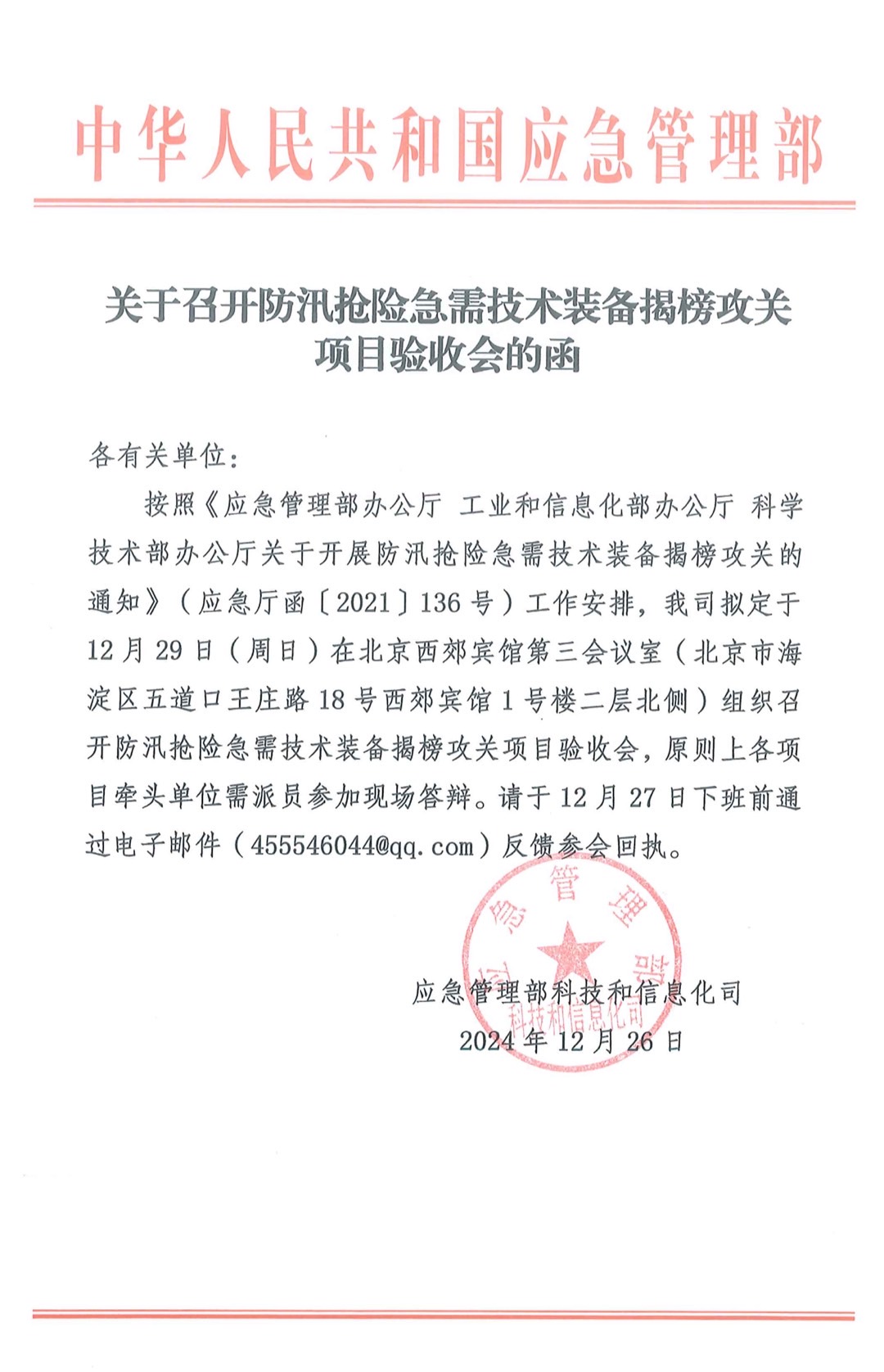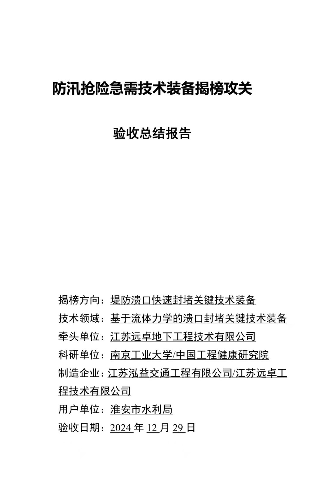 2024年12月29日,国家应急部“防汛抢险急需技术装备揭榜攻关”项目验收会议在北京召开。由江苏远卓地下工程技术公司作为牵头单位,中国工程健康研究院、南京工业大学、江苏泓益交通工程公司、淮安市水利局等分别作为科研、制造和用户单位的联合体团队,历经三年技术攻关、产品研发、应急演练和应用实践后,顺利完成并通过应急部组织的专家答辩和验收评审。