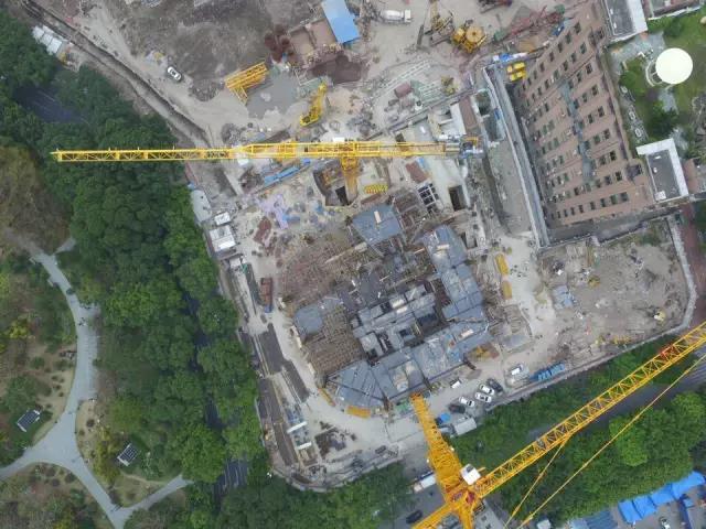 项目周边关系复杂:南方电网220KV超高压电缆横穿工地;广州市地铁6号线经过工程北塔楼施工区,横穿工地地下室;工地南侧紧邻广州重点保护文物——1908年建设完工的广州最早发电厂,二者相距不足2米;距离珠江黄金水道不足10米;施工场地极为狭小,施工红线已靠近四周市政道路,路边古树高达二三十米,西面正在使用的变电站和南面文物像两个方盒子嵌入工地内……开工之初便被业内人士评价为全国施工最复杂、难度最大城市综合体项目,不得不采用逆作法施工。