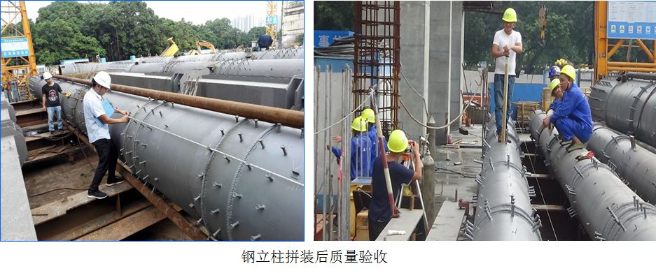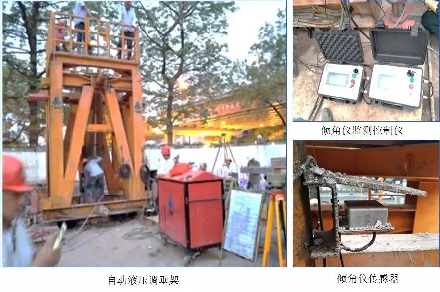 (4)钢柱安装垂直度控制偏差要求≤1/1000,不得大于35mm,钢柱垂直度要求非常高,在全国逆作法范围尚属首例。在公司乃至局总部技术力量的大力支持下,项目团队昼夜攻关,研发并采用专用调垂装置,并通过严格的使用工艺流程控制,使得钢立柱安装垂直度最终达到了≤1/1000的精度,最高精度达到1/2400,是国内逆作法施工钢立柱安装的最高精度,并获得了行业媒体的广泛报道。