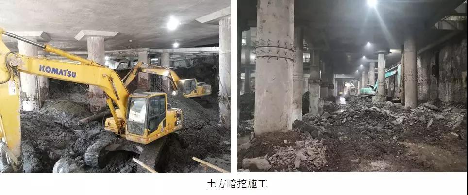 (2)土方暗挖挖机设备容易碰撞钢柱、预留插筋等,且闹市区土方开挖限时,夜间土方外运受城管堵门等影响,出土时间基本为凌晨12点以后,有效出土时间为5h,逆作法土方开挖难度和进度压力极大。