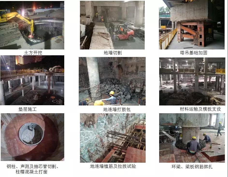 南塔除了常规的土建结构施工外,还需考虑专业分包间合理的工序穿插衔接施工,主要协调工作如下:土方开挖,地连墙打鼓包,地墙切割,植筋及拉拔试验,塔吊基础加固,钢柱牛腿、栓钉焊接,预留预埋,钢柱切割,柱帽混凝土打凿,主材、周转材运输运规划,劳动力分流统筹工作安排,协调工程量巨大。