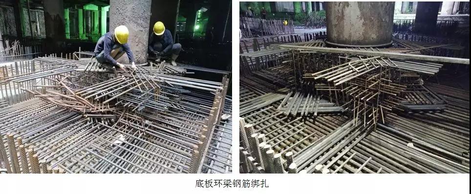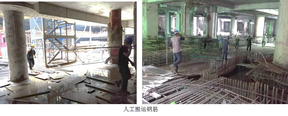 底板钢筋工程量大,且由于前期已封闭两个取土口,塔吊无法吊运材料,大量钢筋需通过人工从取土口位置搬运至现场进行安装。另有超过65%的钢柱与底板之间设置了环梁节点,且节点构造复杂,钢筋数量多,施工难度极大,工效极低。