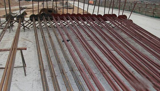锚杆材料可根据锚固工程性质、锚固部位和工程规模等因素,选择高强度、低松弛的普通钢筋、高强精轧螺纹钢筋、预应力钢丝或钢绞线。锚杆材料的物理力学性能应符合现行国家标准以及有关专门标准的规定。锚杆下料长度为钻孔长度+锚入上部结构长度。其中锚入上部结构的长度应符合钢筋的锚固长度要求。除锈处理采用钢丝刷清除钢筋、焊管铁锈。